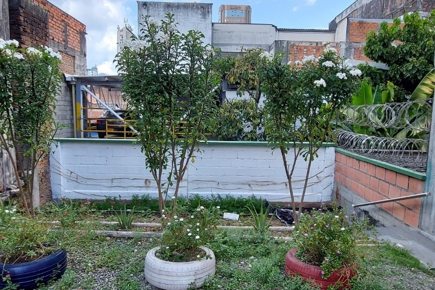 Desde el 2020 decidimos darle un nuevo aire a nuestro parqueadero: al fondo late una huerta urbana que crece con nosotros y se embellece cada año.