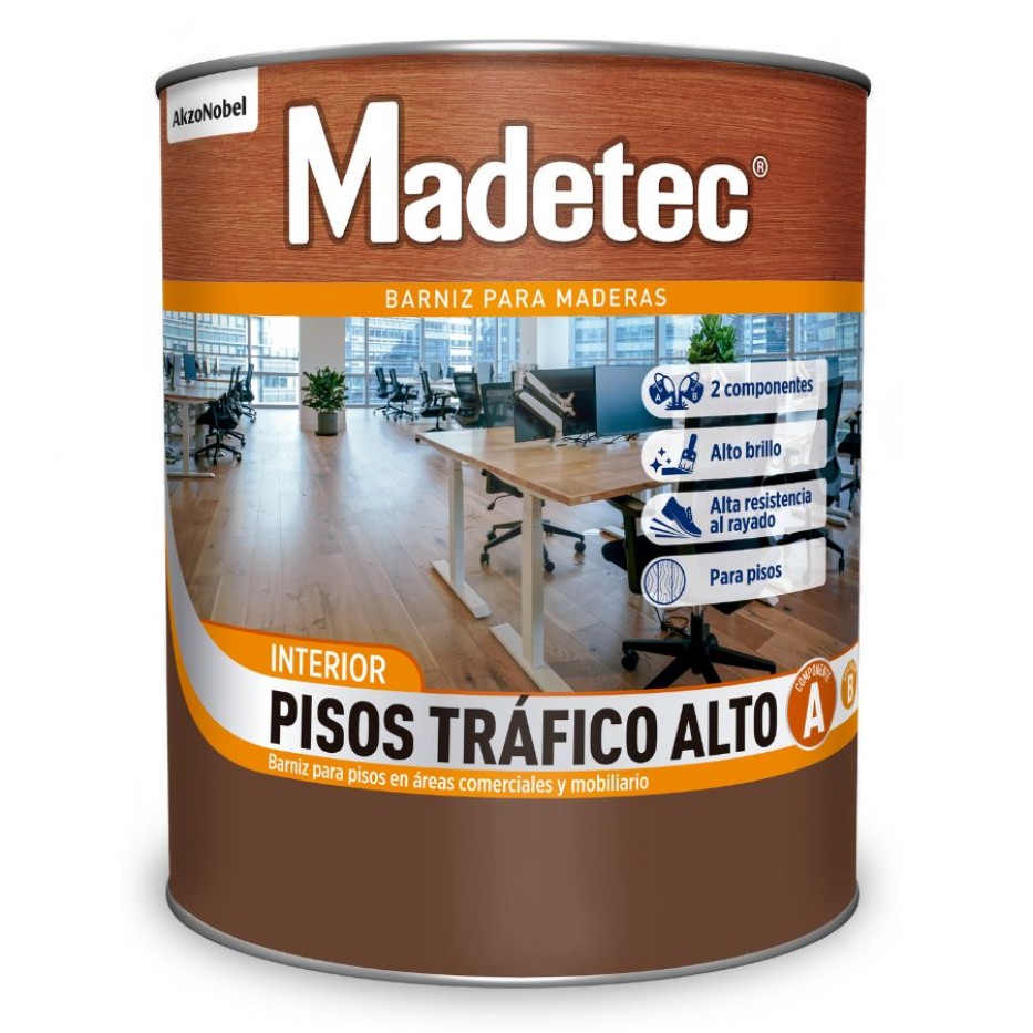 Componente A para el barniz poliuretano de dos componentes Madetec Pisos Tráfico Alto, cuya mezcla en las proporciones indicadas con el componente B (Catalizador) produce un acabado transparente y de excelente tersura, con alta resistencia al rayado, y al contacto accidental con agua, productos químicos, licores y alimentos.